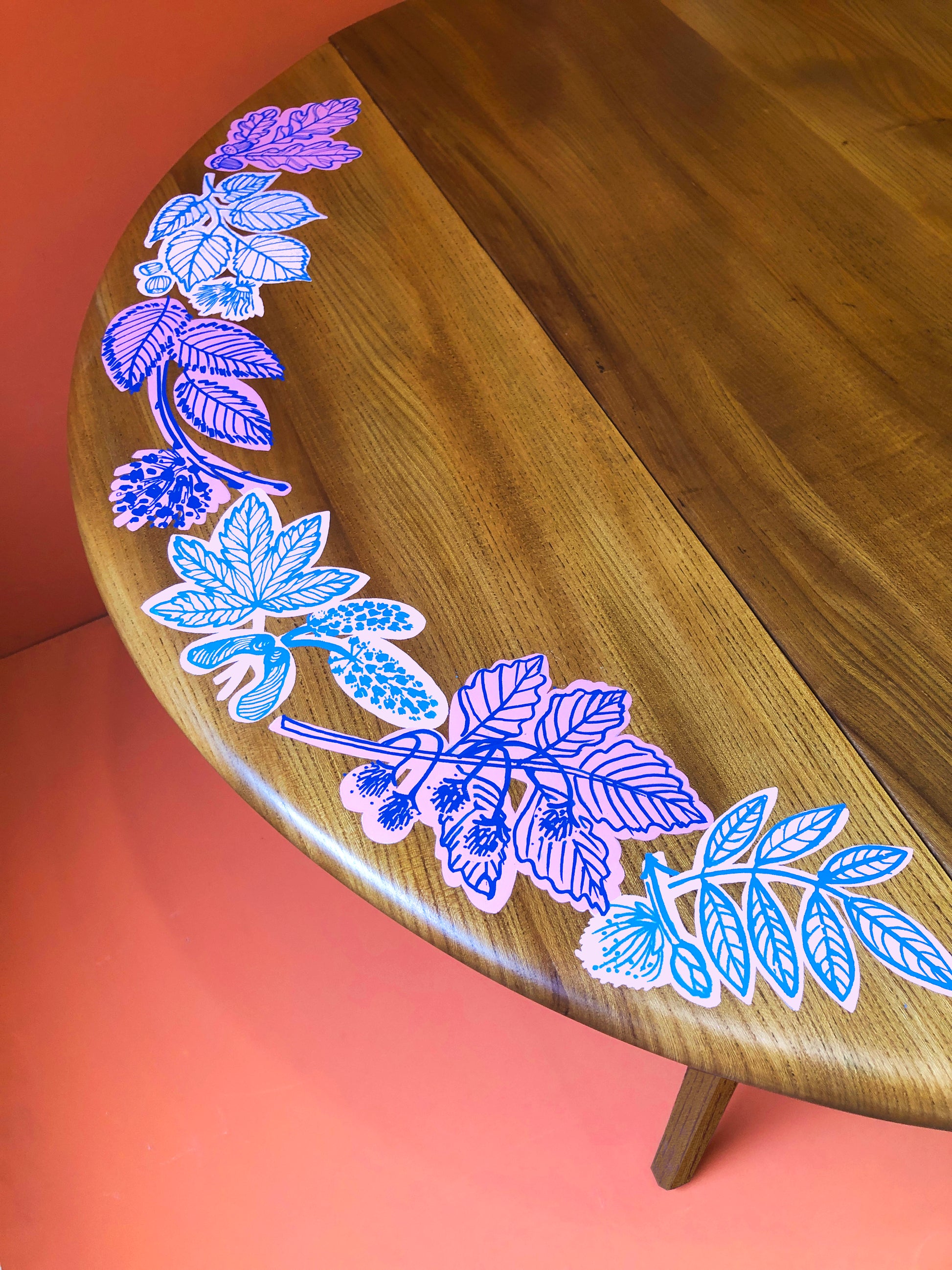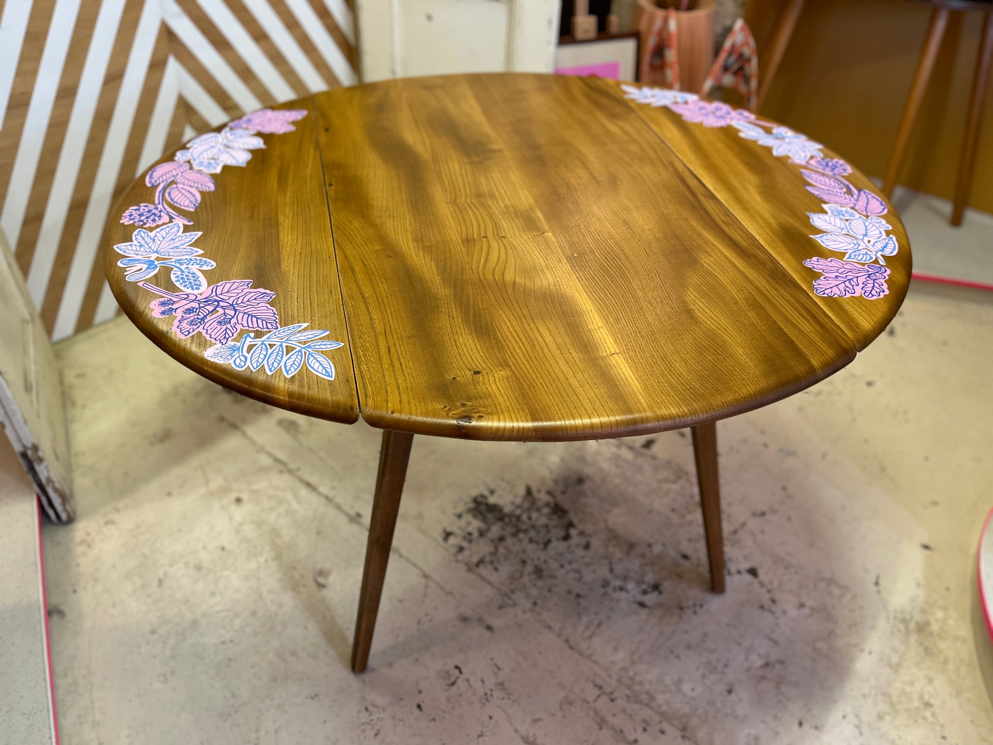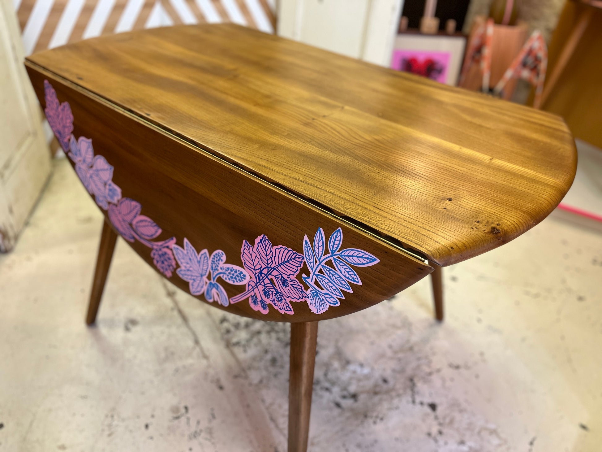 Introducing the Ercol Chilterns Drop Leaf Table, made from beautiful elm and inspired by the woodlands near the original 1950s Ercol factory. This table has been carefully restored and features lovely prints of leaves and fruits from local Chiltern trees. With its practical drop leaf design, it’s perfect for small or large spaces, bringing a touch of rustic charm and elegance to any dining area.