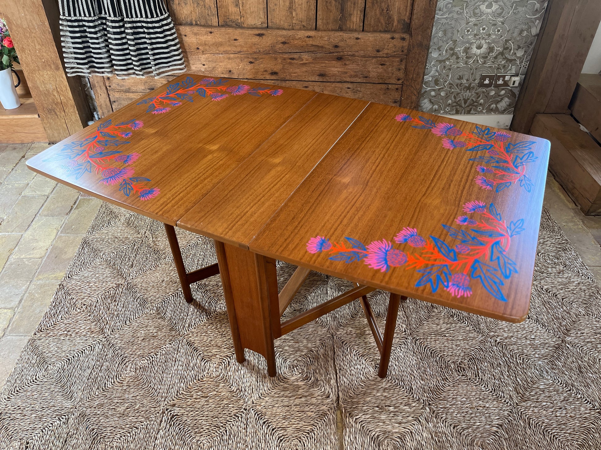 This 1960's teak AH McIntosh double extending dining table has been enhanced with a vibrant screen-printed thistle design, by Margate screen-printer Zoe Murphy.